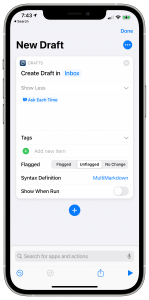 If you are a Drafts user, this shortcut is made to open Drafts and begin a new draft document. On the surface this may seem redundant as Drafts is made to automatically open with a new draft note ready to be written in. The difference between this shortcut and simply opening Drafts to begin writing is that you’re able to preconfigured items you otherwise can’t in Drafts. For example, you can edit this shortcut and have “idea” as a built in tag. Now, whenever you have an idea you can simply run this shortcut, type in what your idea is, and Drafts automatically has the “idea” tag assigned to that note.