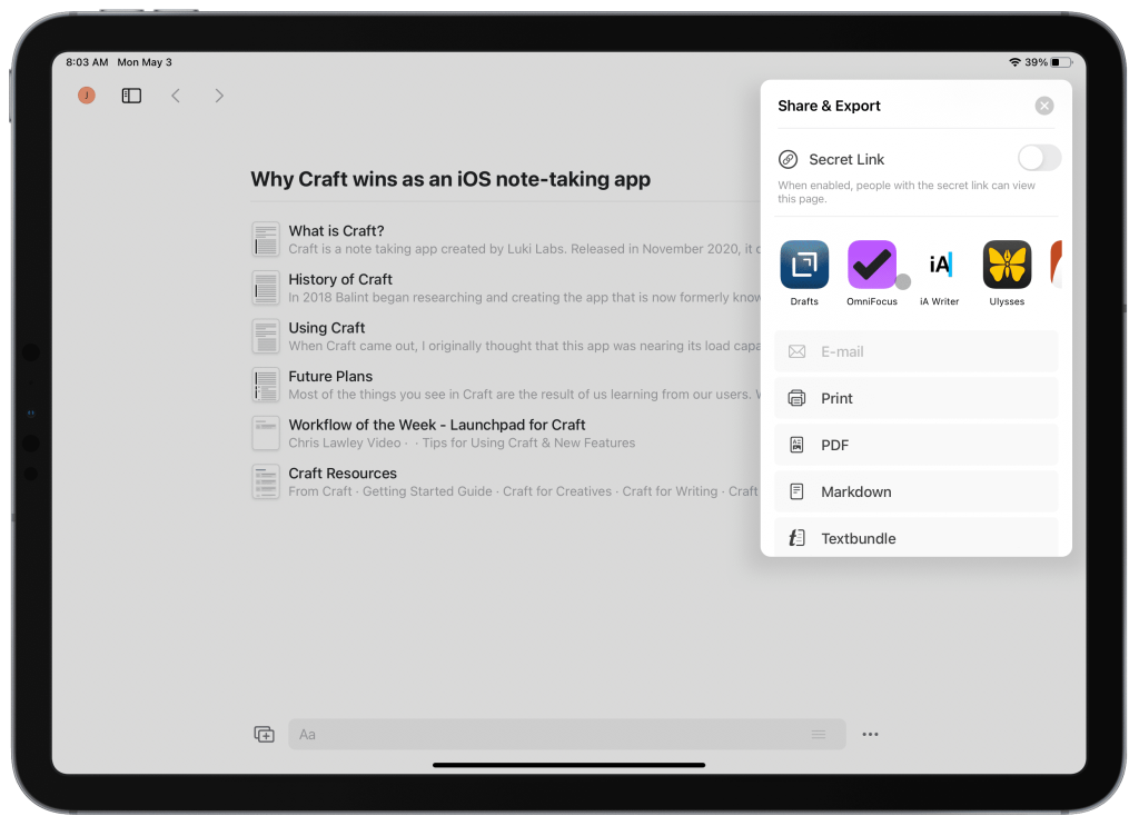 Speaking of exporting, there are direct app integrations with apps like Drafts, OmniFocus, Things 3, Ulysses, and more. With just a simple tap in the export options you can send your Craft note to the app of your choosing like magic.