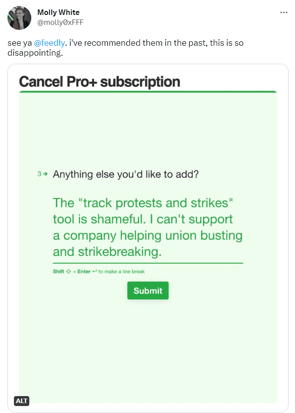 Feedly, the popular RSS feed service, recently came under fire for a now-deleted blog post (here is an Internet Wayback Machine link) in which they discussed using AI models to track protests, riots, and rallies. Many people were concerned that this technology could be used by employers and corporations to engage in union busting, worker surveillance, and strikebreaking.
